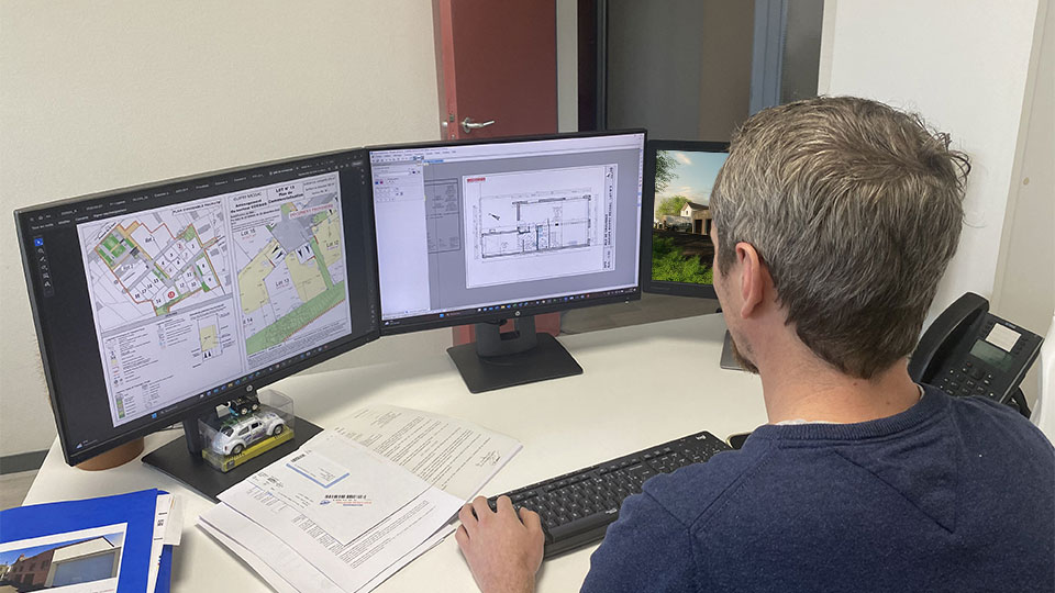 Sylvain est un dessinateur dans le bâtiment. Ce métier consiste à être l’intermédiaire entre la phase commerciale et la phase travaux. Cela implique la conception de plans de nouvelles maisons, en s’appuyant sur les échanges avec l’architecte conseil, l’équipe commerciale ainsi que les règles de construction (réglementation thermique RE2020, norme d’accès PMR, ventilation, …) et les règles d’urbanisme.
