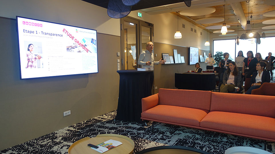 Lors de sa prise de parole, le dirigeant de l’entreprise a présenté dans le détail les différentes étapes de la rénovation énergétique d’ampleur, de la pré-étude initiale à la réalisation effective des travaux, en passant par l’intervention d’un expert énergéticien pour identifier les travaux à effectuer. Il a également abordé plusieurs cas clients, avec des exemples d’étude et scénarii de rénovation, le budget à prévoir selon une simulation, tout en expliquant les règles à respecter pour bénéficier des aides à la rénovation.