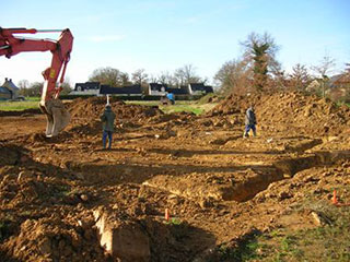 Les fouilles préparent le sol pour les fondations d’une maison. Une fois le sol creusé, on vérifie la profondeur et la qualité du fond de fouille, ainsi que l’altimétrie de la plateforme. Ces étapes garantissent la stabilité et la durabilité de la construction.