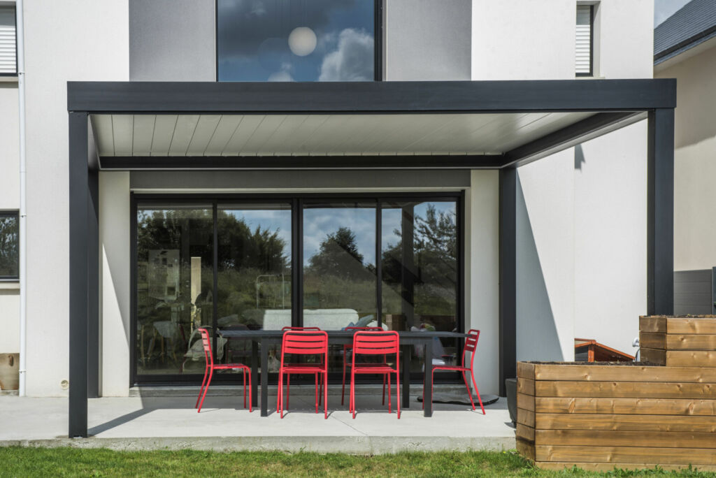 À l’extérieur, cette maison située aux portes de Rennes ne manque pas de charme. Une grande terrasse invite à la détente, tandis qu’une pergola offre un espace ombragé idéal pour les repas en famille. La présence d’une grande baie vitrée accentue la connexion entre l’intérieur et l’extérieur, créant ainsi une harmonie parfaite entre les deux espaces de vie.