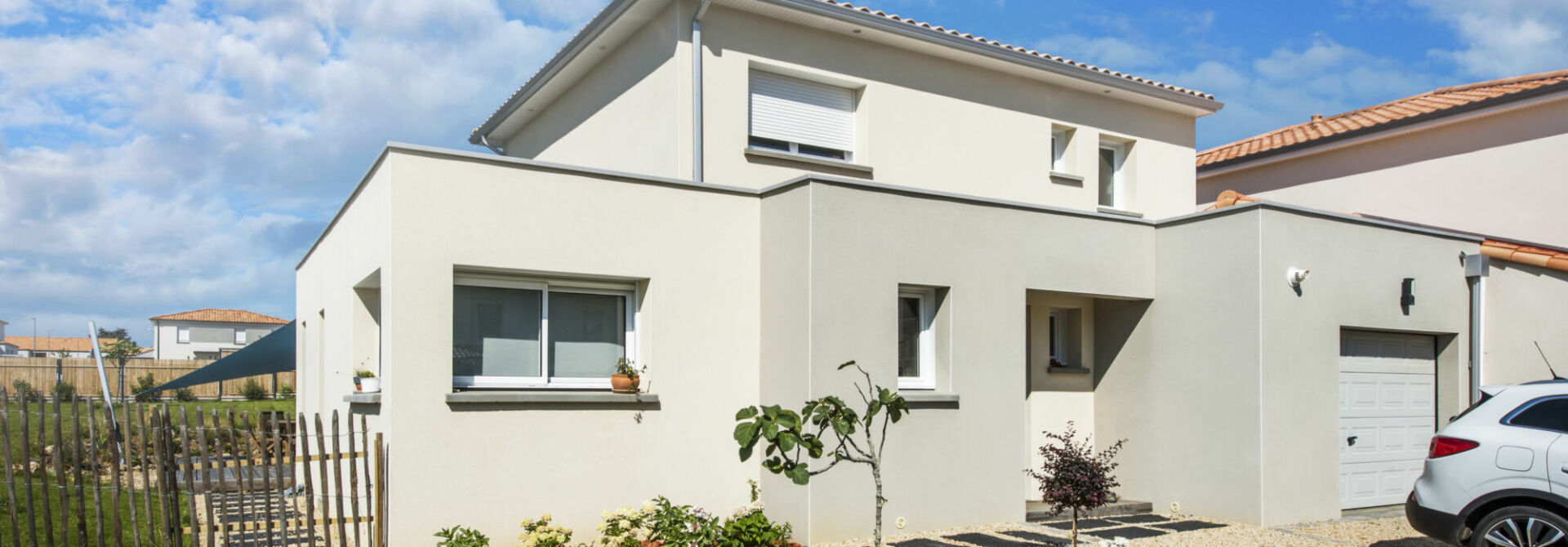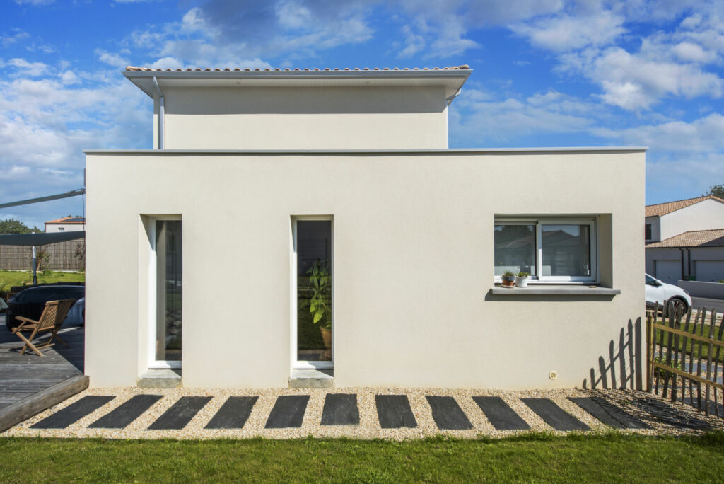 La maison se distingue par sa toiture en tuile, son enduit gratté ton guérande et ses avancées en gris, offrant ainsi un mariage harmonieux entre élégance et modernité. Les menuiseries blanches apportent une touche de luminosité et de raffinement à l’ensemble.
