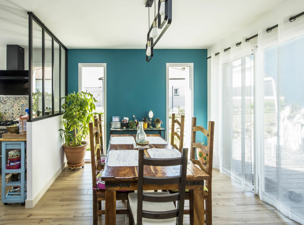 Sur la façade sud, nos clients ont choisi d’installer deux fenêtres meurtrières, permettant ainsi de maximiser la luminosité naturelle tout en apportant une touche d’originalité. Les deux baies vitrées dans la pièce de vie invitent à profiter des extérieurs en famille, entre amis…