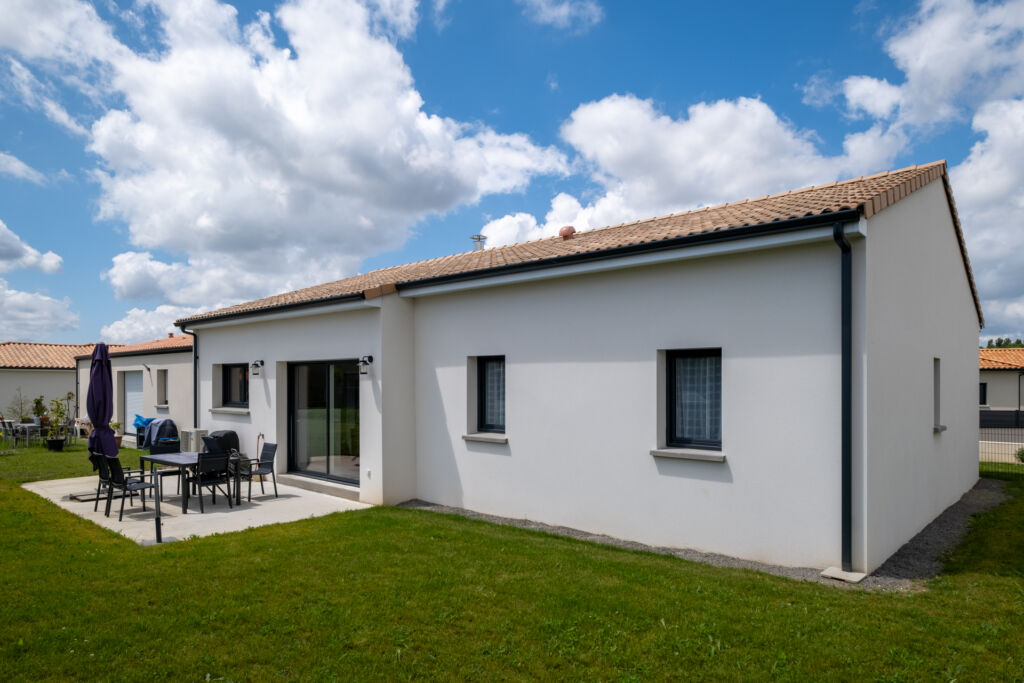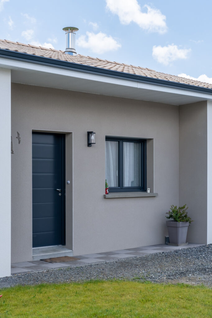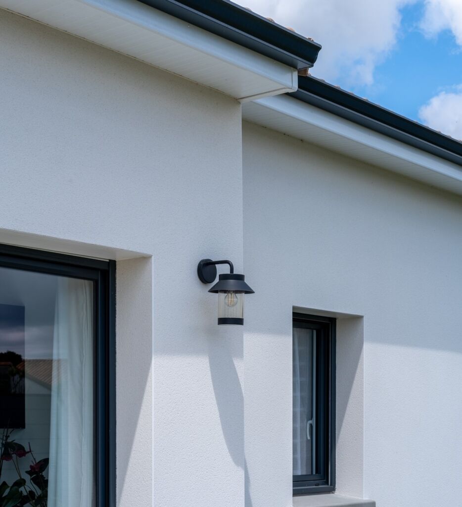 L’architecture traditionnelle de cette maison est sublimée par une toiture en tuiles et un ravalement blanc. La touche de couleur taupe dans le renfoncement de l’entrée principale ajoute une note contemporaine et distingue visuellement la maison dans le lotissement. »