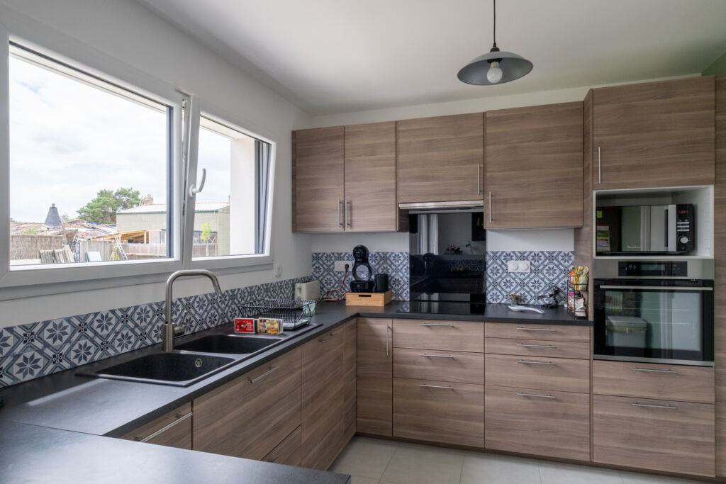 Pour compléter la construction de la maison, un office a été installé. Judicieusement placé, il permet de relier le garage de 18 m² à la cuisine, facilitant ainsi le rangement des courses et l’accès au jardin. Ce détail architectural est un véritable atout pour le quotidien des résidents.