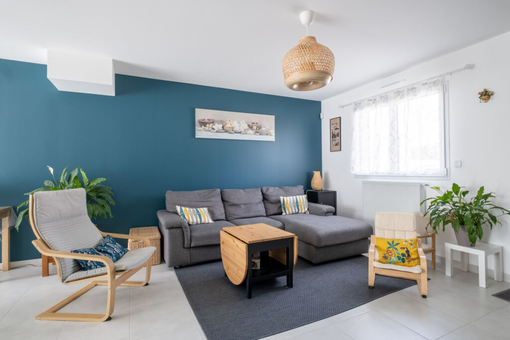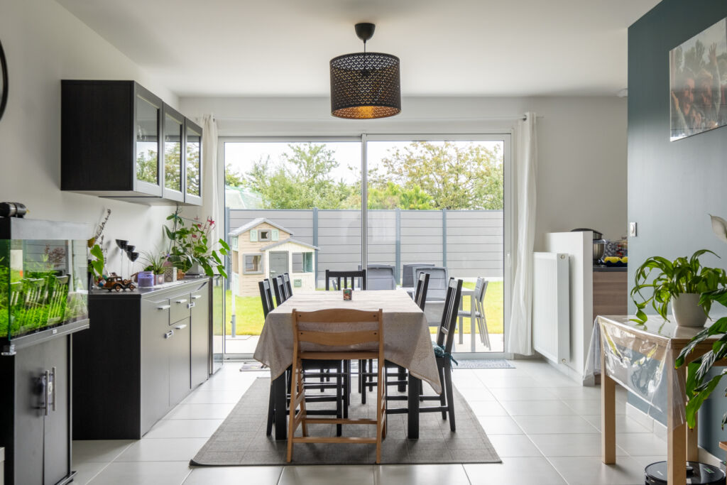 Notre coup de cœur pour cette maison est sans aucun doute la baie vitrée qui inonde la pièce de vie de lumière naturelle et ouvre sur une belle terrasse orientée sud-est. Cet espace extérieur est idéal pour profiter des beaux jours, que ce soit pour un repas en famille, une pause détente ou pour les jeux de l’enfant. La transition fluide entre l’intérieur et l’extérieur apporte une sensation d’espace et de liberté.